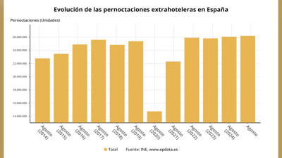 Las pernoctaciones en alojamientos turísticos extrahoteleros españoles (apartamentos, campings, alojamientos de turismo rural y albergues) superaron la cifra de 26,1 millones en agosto, lo que supone un aumento del 0,6% respecto al mismo mes del año pasado, según datos del Instituto Nacional de Estadística (INE) publicados este miércoles.