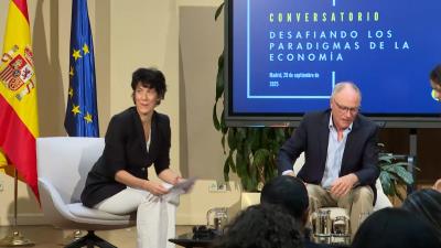 Imágenes de la ministra de Inclusión, Seguridad Social y Migraciones, Elma Saiz, que ha mantenido el conversatorio "El círculo vicioso de la xenofobia".