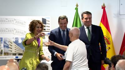 Imágenes del presidente de la Junta de Andalucía, Juanma Moreno, y de la ministra de Hacienda y secretaria general del PSOE-A, María Jesús Montero, durante el acto de entrega de llaves de la segunda fase de los alojamientos Sama Naharro destinados a alquiler social para personas mayores en Córdoba.