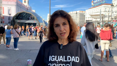 Con motivo del Día Mundial de los animales, activistas convocados por la Fundación Igualdad Animal, han protagonizado una protesta en el centro de Madrid, reclamando la prohibición de la alimentación forzada a la que se somete a patos y ocas para producir foie gras. "Una de las prácticas más crueles de la industria alimentaria", ha afirmado Anna Mulá, gerente de incidencia legislativa de Igualdad Animal. (Fuente: Igualdad Animal)