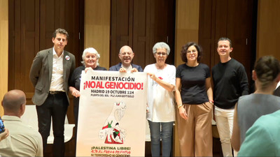 Imágenes de la plataforma PararLaGuerra.es, quienes han ofrecido este miércoles una rueda de prensa para presentar la convocatoria de movilizaciones en todas las autonomías y una manifestación el 19 de octubre en Madrid.
