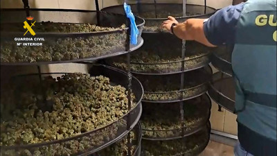 Imágenes de la plantación de marihuana hallada en un contenedor enterrado bajo una explotación avícola en Sanlúcar de Barrameda (Cádiz), así como de los agentes en la finca. (Fuente: Guardia Civil)