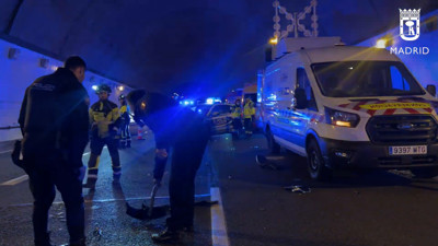 Imágenes de un accidente de moto en el túnel de la M23 salida, km 1 (Madrid). SAMUR-PC confirma el fallecimiento de un hombre de unos 55 años tras impactar contra un vehículo de conservación de carreteras que señalizaba un accidente previo. (Fuente: Emergencias Madrid)